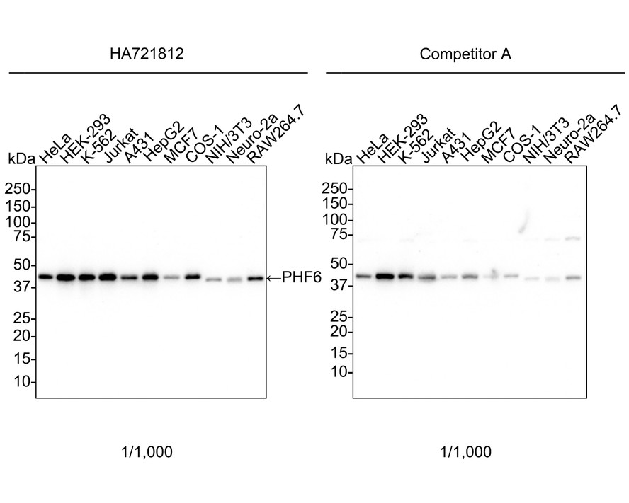 Western blot analysis of PHF6 on different lysates with Rabbit anti-PHF6 antibody (HA721812) at 1/1,000 dilution and competitor's antibody at 1/1,000 dilution.