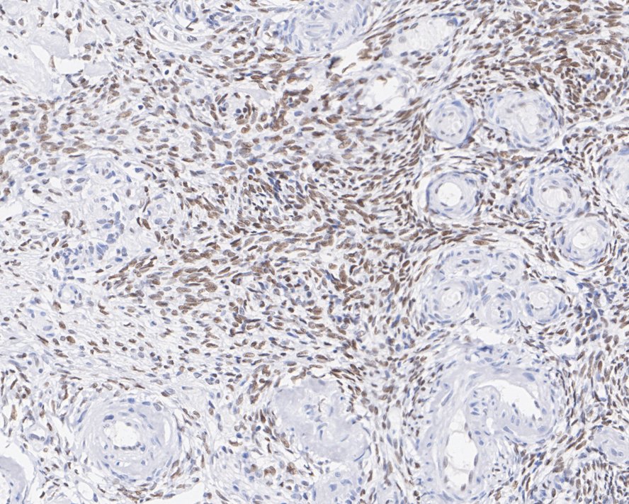 Immunohistochemical analysis of paraffin-embedded human ovary tissue with Rabbit anti-PHF6 antibody (HA721812) at 1/1,000 dilution.