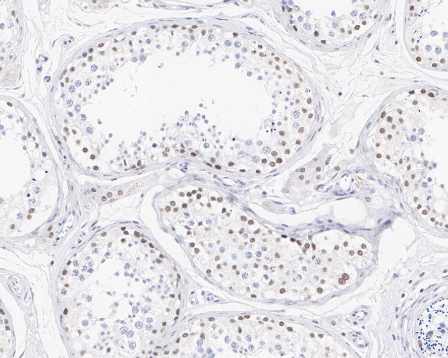 Immunohistochemical analysis of paraffin-embedded human testis tissue with Rabbit anti-PHF6 antibody (HA721812) at 1/1,000 dilution.