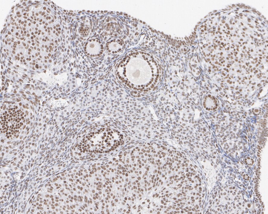 Immunohistochemical analysis of paraffin-embedded mouse ovary tissue with Rabbit anti-PHF6 antibody (HA721812) at 1/1,000 dilution.