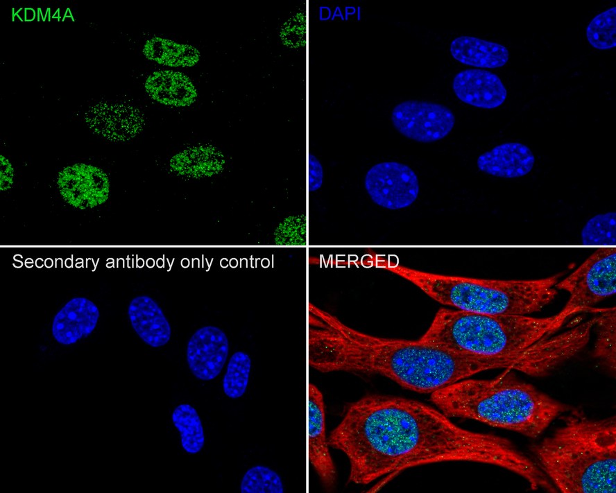 Cells were fixed in 4% paraformaldehyde for 20 minutes at room temperature, permeabilized with 0.1% Triton X-100 in PBS for 5 minutes at room temperature, then blocked with 1% BSA in 10% negative goat serum for 1 hour at room temperature. Cells were then incubated with Rabbit anti-KDM4A antibody (HA722026) at 1/100 dilution in 1% BSA in PBST overnight at 4 ℃. Goat Anti-Rabbit IgG H&L (iFluor™ 488, HA1121) was used as the secondary antibody at 1/1,000 dilution. PBS instead of the primary antibody was used as the secondary antibody only control. Nuclear DNA was labelled in blue with DAPI.