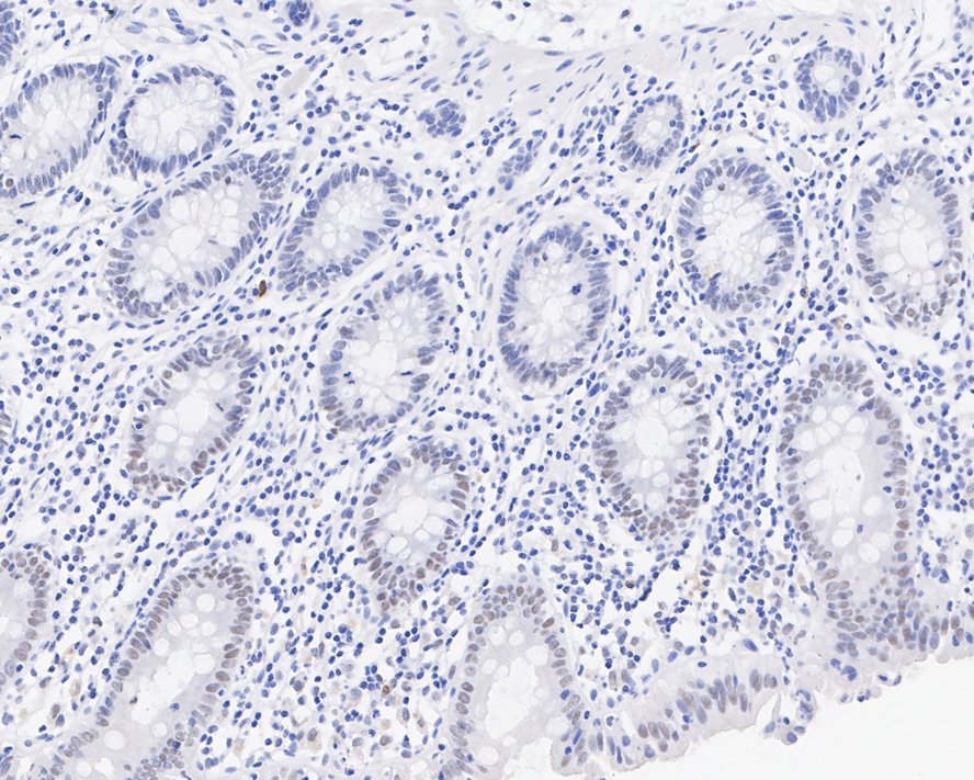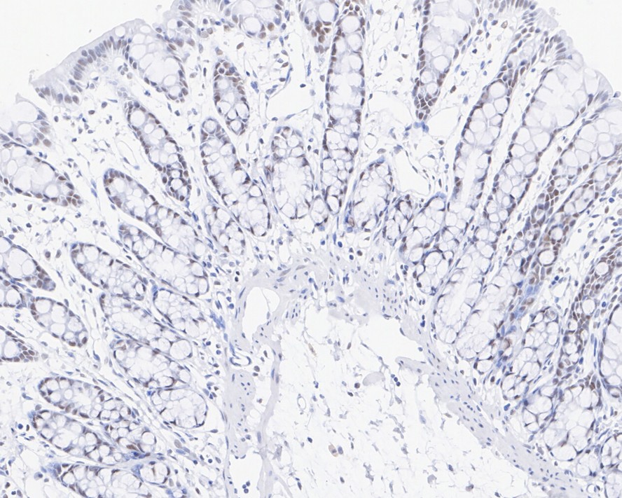 Immunohistochemical analysis of paraffin-embedded human colon tissue with Rabbit anti-KDM4A antibody (HA722026) at 1/1,000 dilution.