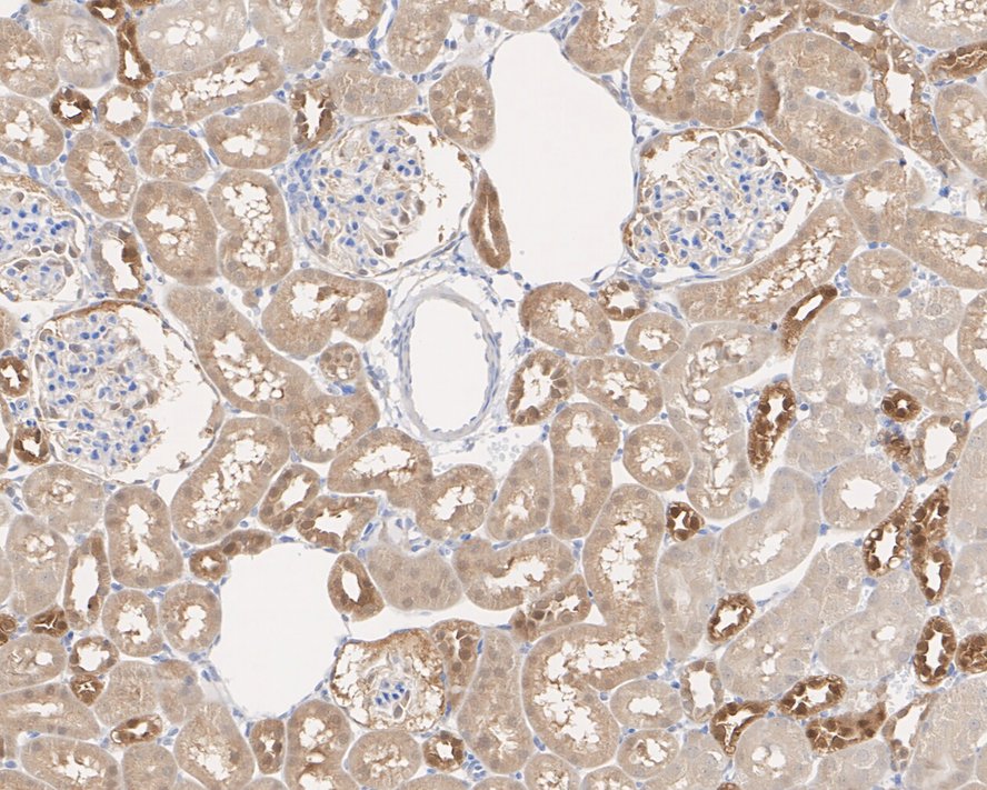 Immunohistochemical analysis of paraffin-embedded mouse kidney tissue with Rabbit anti-Peroxiredoxin 5 antibody (HA722061) at 1/10,000 dilution.