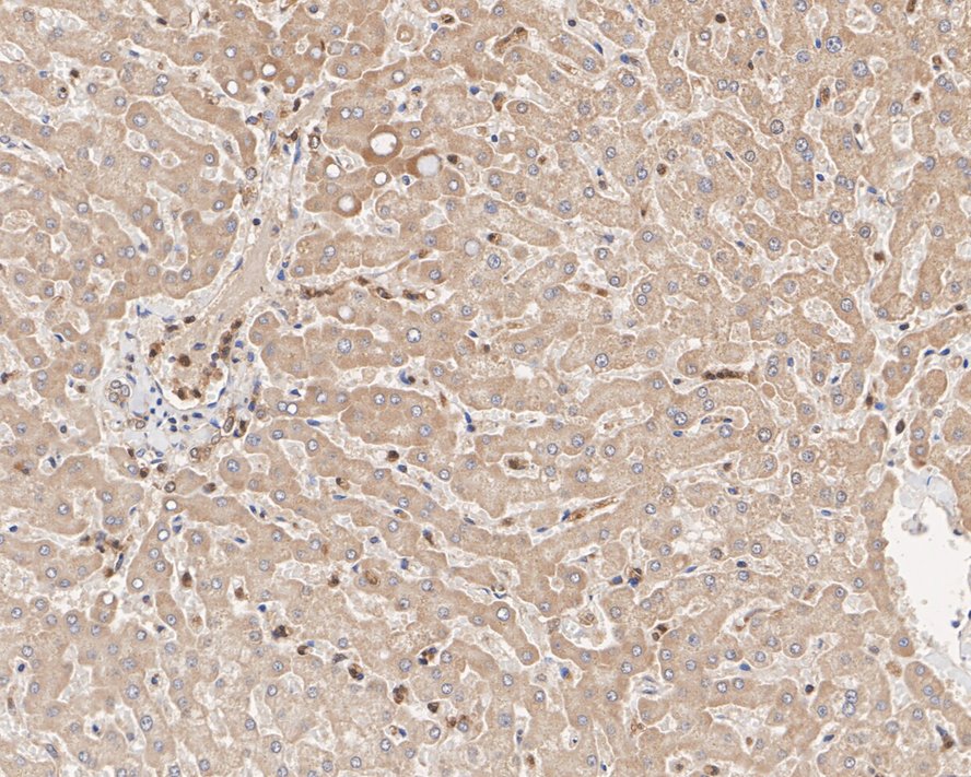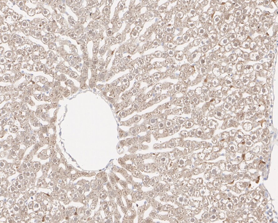Immunohistochemical analysis of paraffin-embedded mouse liver tissue with Rabbit anti-Peroxiredoxin 5 antibody (HA722061) at 1/10,000 dilution.