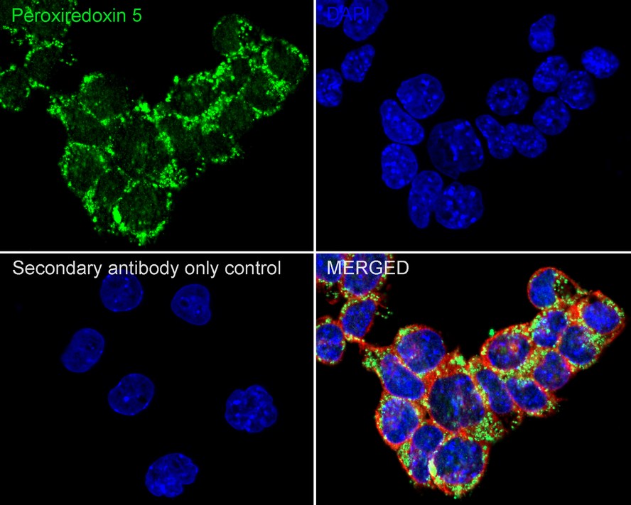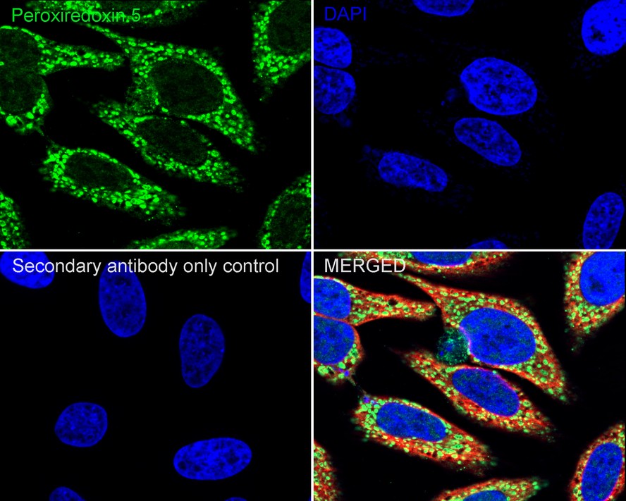 Cells were fixed in 4% paraformaldehyde for 20 minutes at room temperature, permeabilized with 0.1% Triton X-100 in PBS for 5 minutes at room temperature, then blocked with 1% BSA in 10% negative goat serum for 1 hour at room temperature. Cells were then incubated with Rabbit anti-Peroxiredoxin 5 antibody (HA722061) at 1/100 dilution in 1% BSA in PBST overnight at 4 ℃. Goat Anti-Rabbit IgG H&L (iFluor™ 488, HA1121) was used as the secondary antibody at 1/1,000 dilution. PBS instead of the primary antibody was used as the secondary antibody only control. Nuclear DNA was labelled in blue with DAPI.