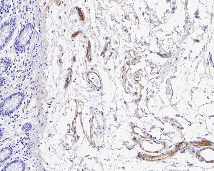 Immunohistochemical analysis of paraffin-embedded human colon tissue with Rabbit anti-C9 antibody (HA722136) at 1/1,000 dilution.