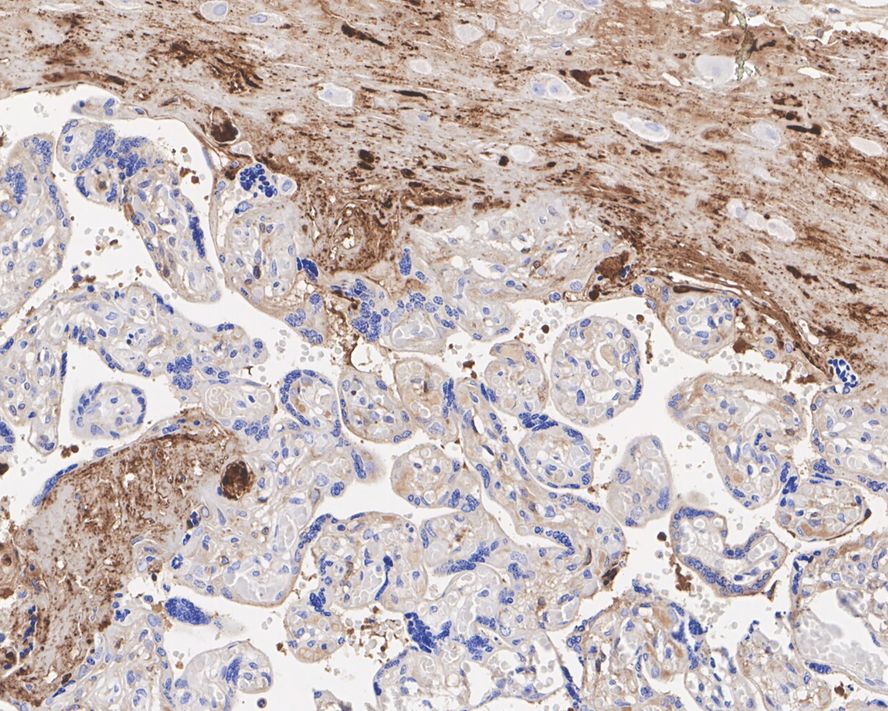 Immunohistochemical analysis of paraffin-embedded human placenta tissue with Rabbit anti-C9 antibody (HA722136) at 1/1,000 dilution.