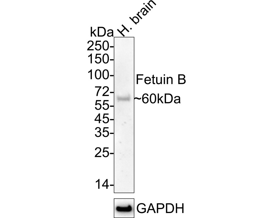 Western blot analysis of Fetuin B on human brain tissue lysates with Rabbit anti-Fetuin B antibody (HA722368) at 1/1,000 dilution.