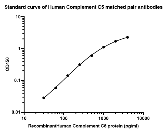 Elisa assay was performed by coating wells of a 96-well plate with 100 µl per well of capture antibody (HA722682) diluted in carbonate/bicarbonate buffer, at a concentration of 5 µg/ml overnight at 4℃. Wells of the plate were washed, blocked with 150 µl 0.05% tween-20 1%BSA blocking buffer, and incubated with serial diluted human Complement C5 protein starting from 4000 pg/ml to 0 pg/ml and detect antibody (HA722683, Biotin, 0.2 µg/ml) for 1 hour at 30℃ with shaking. Then the plate was washed and incubated with 100 µl per well of SA-HRP for 0.5 hour at 30℃ with shaking. Detection was performed using an Ultra TMB Substrate for 10 minutes at room temperature in the dark. The reaction was stopped with sulfuric acid and absorbances were read on a spectrophotometer at 450 nm.