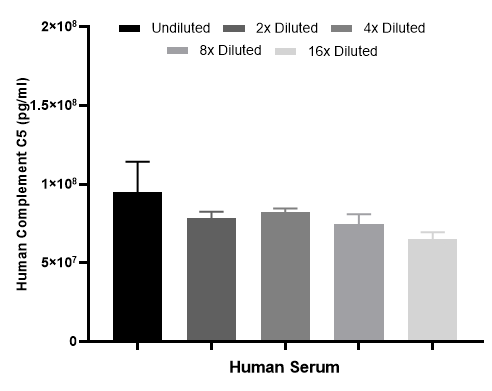 Interpolated concentration of native Complement C5 was measured in duplicate at different sample concentrations. Undiluted samples were 1:10000 serum. The interpolated dilution factor corrected values were plotted (mean +/- SD, n=2). The mean Complement C5 concentration was determined to be 78.3 ug/mL in human serum.
