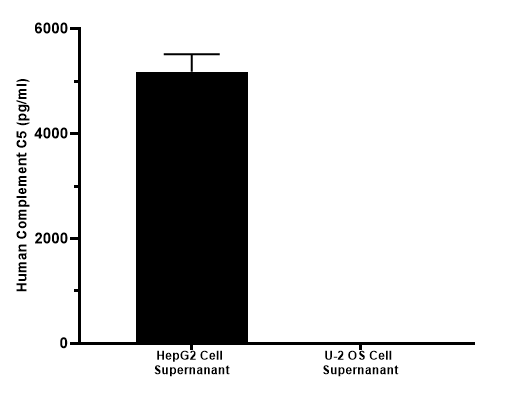 Complement C5 was measured in 100% cell supernatant. The concentrations of Complement C5 were interpolated from the Complement C5 standard curves. The mean Complement C5 concentration was determined to be 5.256 ng/mL in HepG2 cell supernanant. There was no detectable signal in U-2 OS cell supernatant.