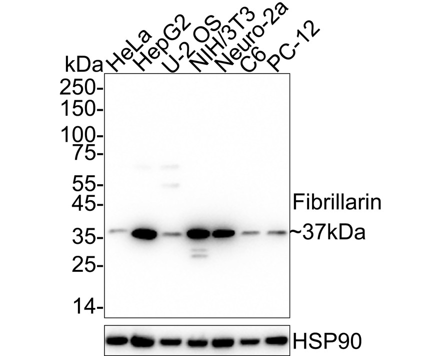 Western blot analysis of Fibrillarin on different lysates with Rabbit anti-Fibrillarin antibody (HA722842) at 1/1,000 dilution.