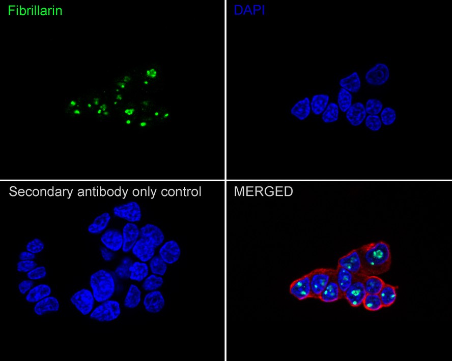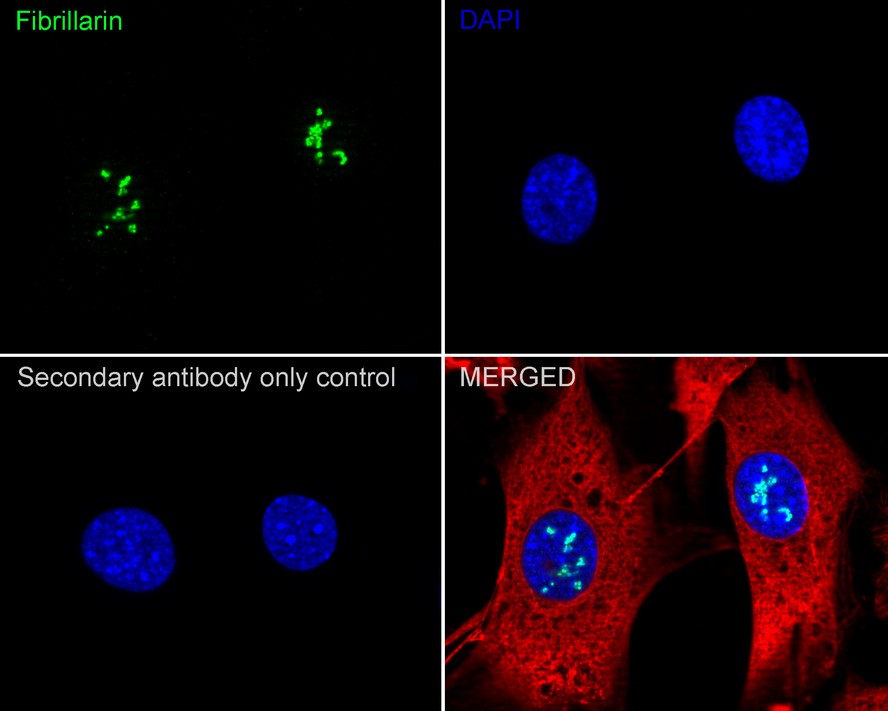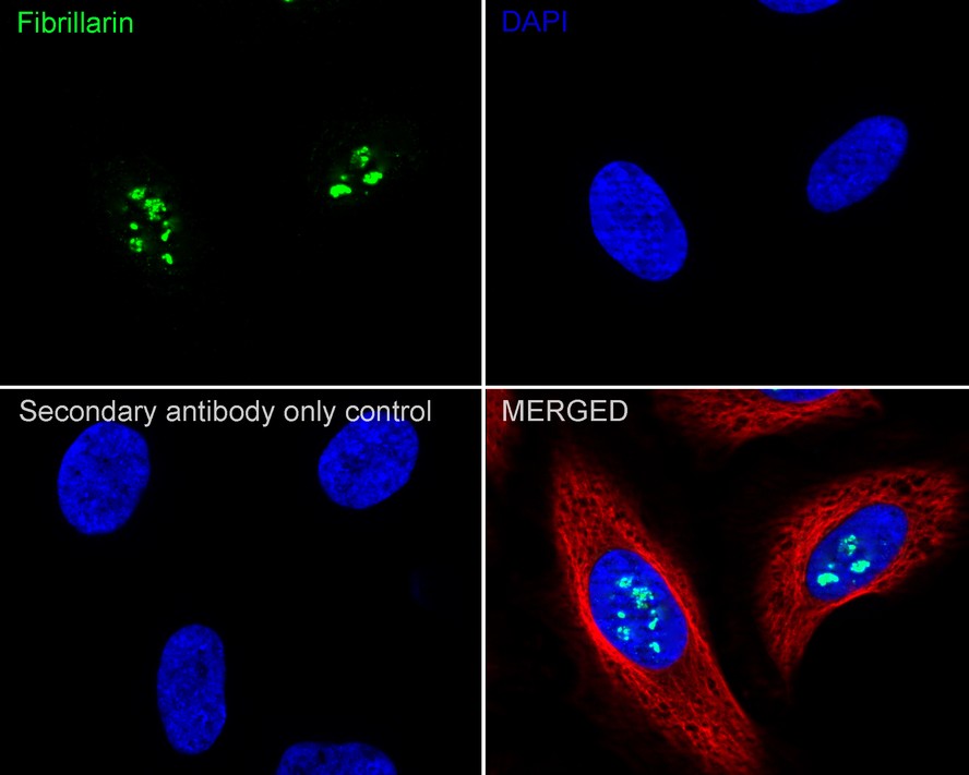 Cells were fixed in 4% paraformaldehyde for 20 minutes at room temperature, permeabilized with 0.1% Triton X-100 in PBS for 5 minutes at room temperature, then blocked with 1% BSA in 10% negative goat serum for 1 hour at room temperature. Cells were then incubated with Rabbit anti-Fibrillarin antibody (HA722842) at 1/1,000 dilution in 1% BSA in PBST overnight at 4 ℃. Goat Anti-Rabbit IgG H&L (iFluor™ 488, HA1121) was used as the secondary antibody at 1/1,000 dilution. PBS instead of the primary antibody was used as the secondary antibody only control. Nuclear DNA was labelled in blue with DAPI.
