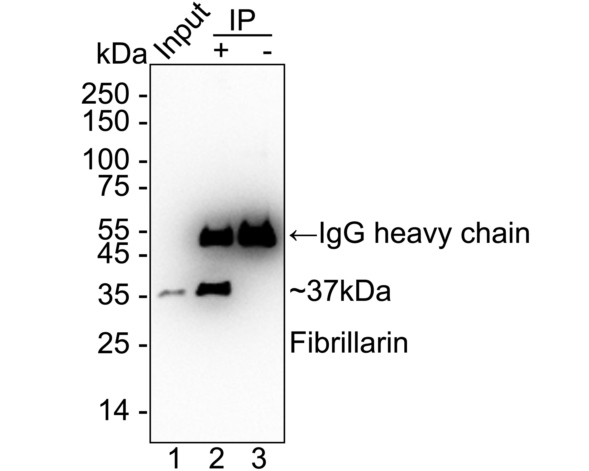 Fibrillarin was immunoprecipitated from 0.2 mg HepG2 cell lysate with HA722842 at 2 µg/10 µl beads. Western blot was performed from the immunoprecipitate using HA722842 at 1/1,000 dilution. Mouse anti Rabbit IgG heavy chain (Fc) secondary antibody (M1003-7) at 1/100,000 dilution was used for 1 hour at room temperature.