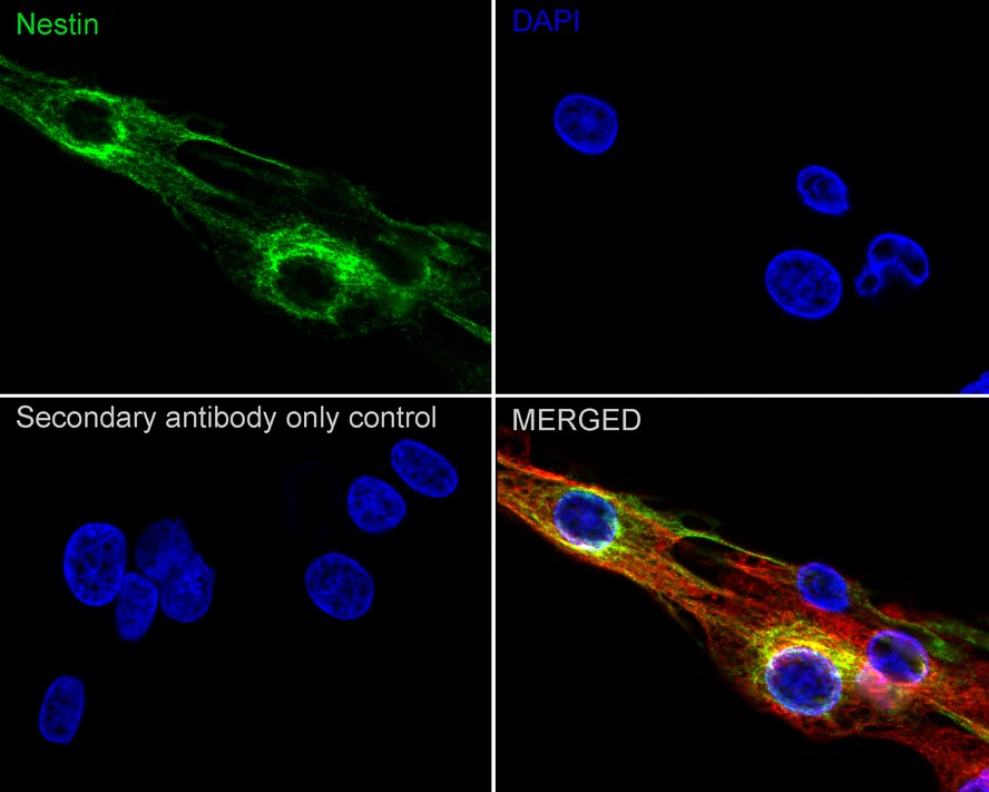 Cells were fixed in 4% paraformaldehyde for 15 minutes at room temperature, permeabilized with 0.1% Triton X-100 in PBS for 15 minutes at room temperature, then blocked with 1% BSA in 10% negative goat serum for 1 hour at room temperature. Cells were then incubated with Rabbit anti-Nestin antibody (HA722919) at 1/5,000 dilution in 1% BSA in PBST overnight at 4 ℃. Goat Anti-Rabbit IgG H&L (iFluor™ 488, HA1121) was used as the secondary antibody at 1/1,000 dilution. PBS instead of the primary antibody was used as the secondary antibody only control. Nuclear DNA was labelled in blue with DAPI.
