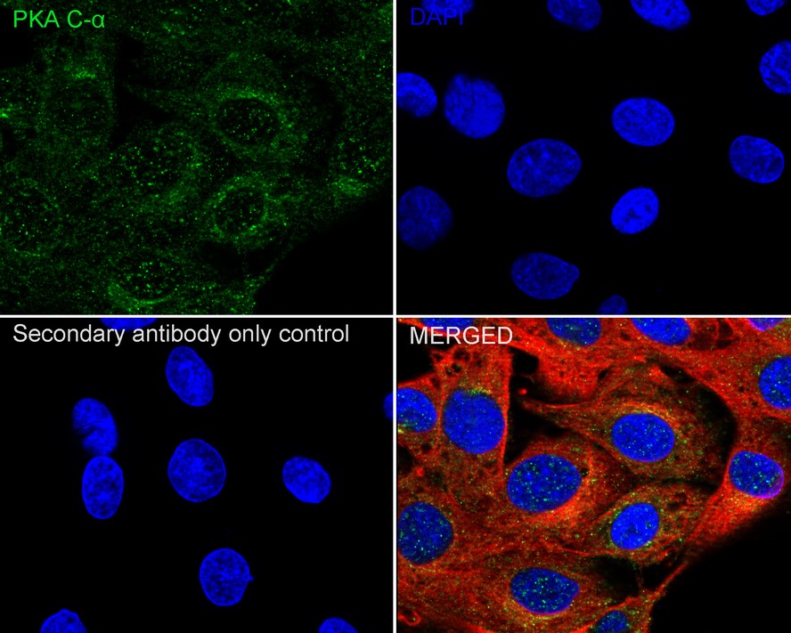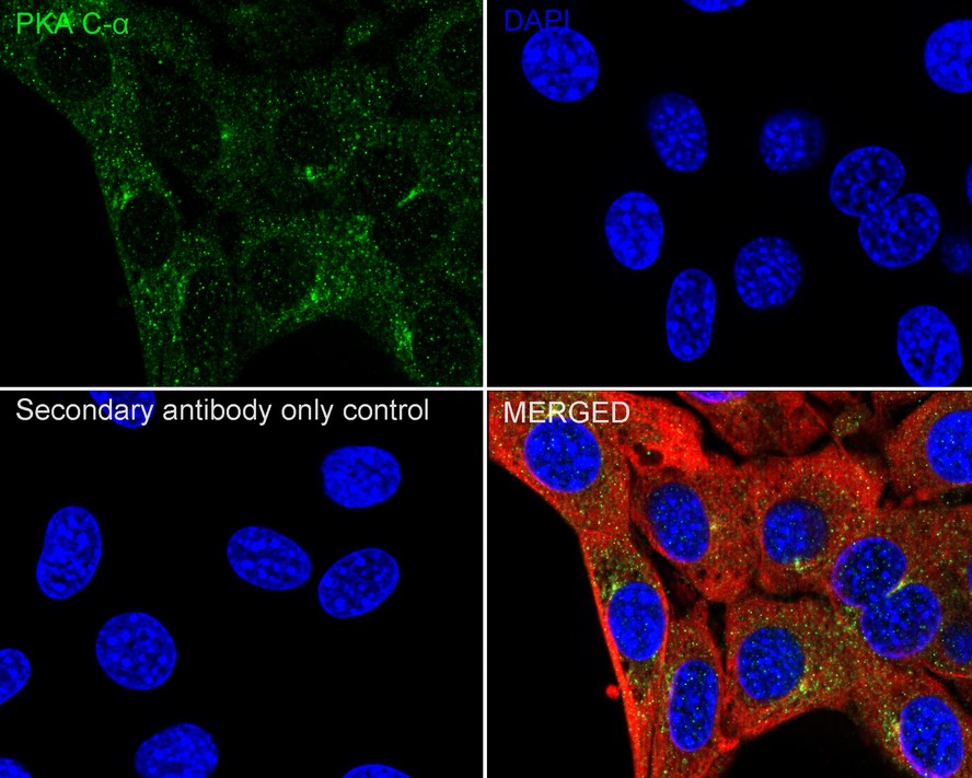 Cells were fixed in 4% paraformaldehyde for 15 minutes at room temperature, permeabilized with 0.1% Triton X-100 in PBS for 15 minutes at room temperature, then blocked with 1% BSA in 10% negative goat serum for 1 hour at room temperature. Cells were then incubated with Rabbit anti-PKA C-alpha antibody (HA723003) at 1/50 dilution in 1% BSA in PBST overnight at 4 ℃. Goat Anti-Rabbit IgG H&L (iFluor™ 488, HA1121) was used as the secondary antibody at 1/1,000 dilution. PBS instead of the primary antibody was used as the secondary antibody only control. Nuclear DNA was labelled in blue with DAPI.