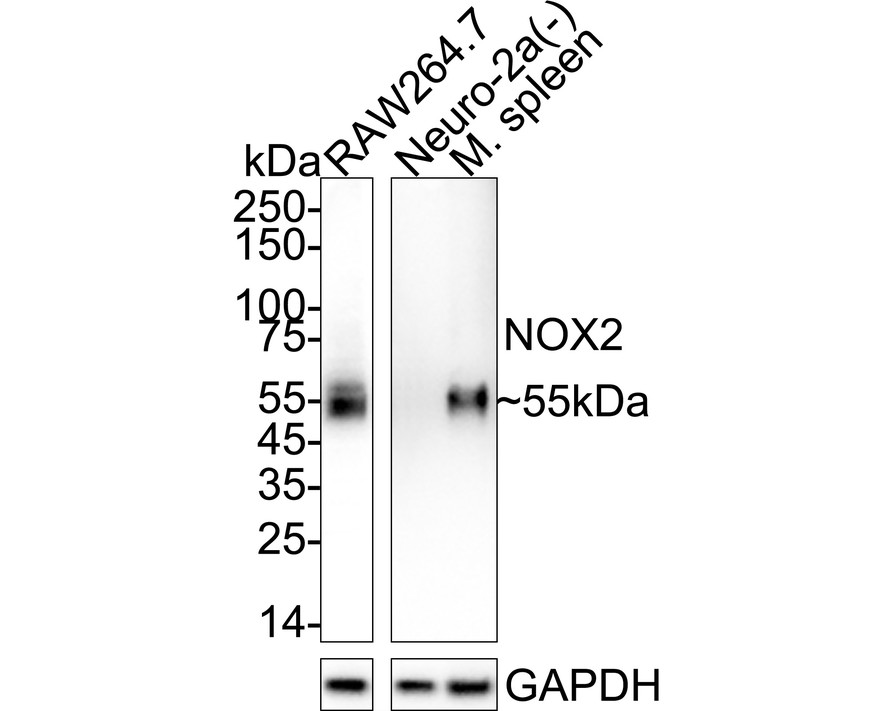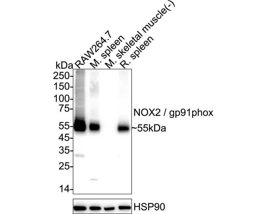 Western blot analysis of NOX2 / gp91phox on different lysates with Rabbit anti-NOX2 / gp91phox antibody (HA723224) at 1/5,000 dilution.