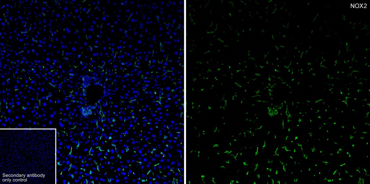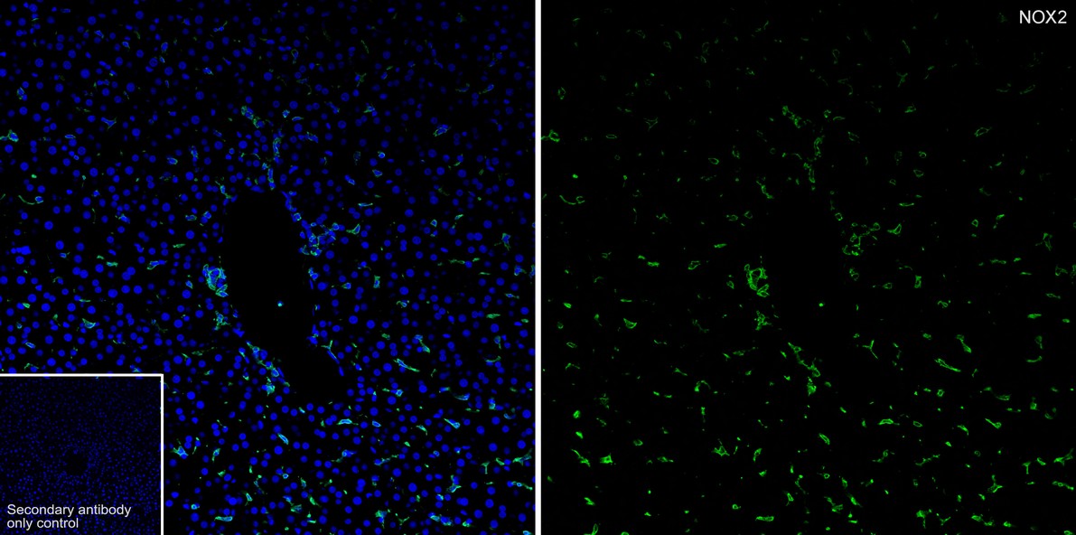 Immunofluorescence analysis of frozen mouse liver tissue with Rabbit anti-NOX2 / gp91phox antibody (HA723224) at 1/500 dilution.