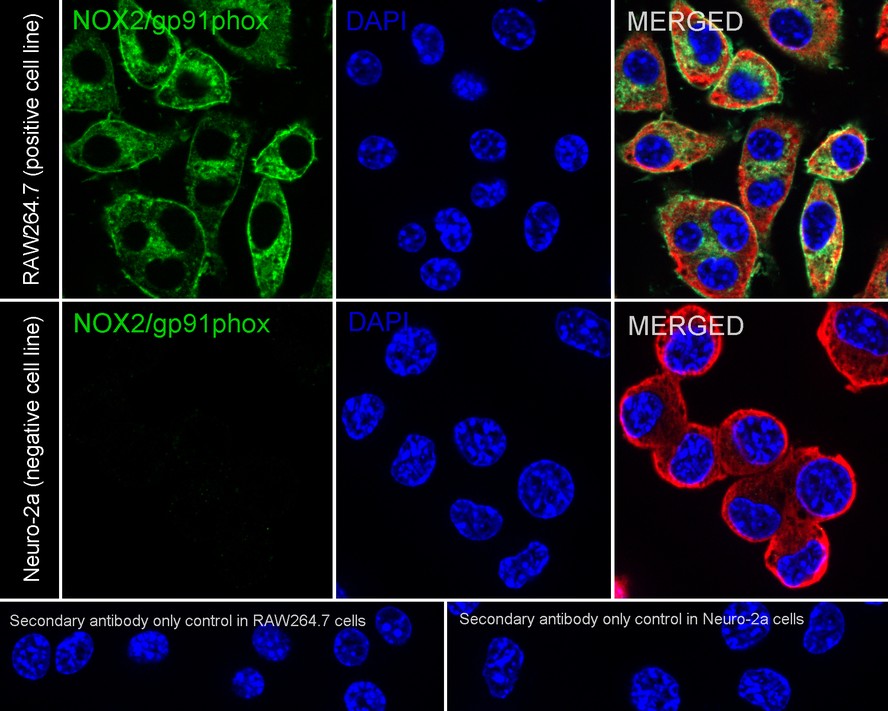 Immunocytochemistry analysis of RAW264.7 (positive) and Neuro-2a (negative) labeling NOX2 / gp91phox with Rabbit anti-NOX2 / gp91phox antibody (HA723224) at 1/500 dilution.