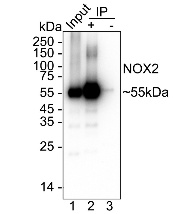 NOX2 / gp91phox was immunoprecipitated from 0.2 mg RAW264.7 cell lysate with HA723224 at 2 µg/10 µl beads. Western blot was performed from the immunoprecipitate using HA723224 at 1/2,000 dilution. HRP Conjugated Anti-Rabbit IgG for IP Nano-secondary antibody at 1/5,000 dilution was used for 1 hour at room temperature.
