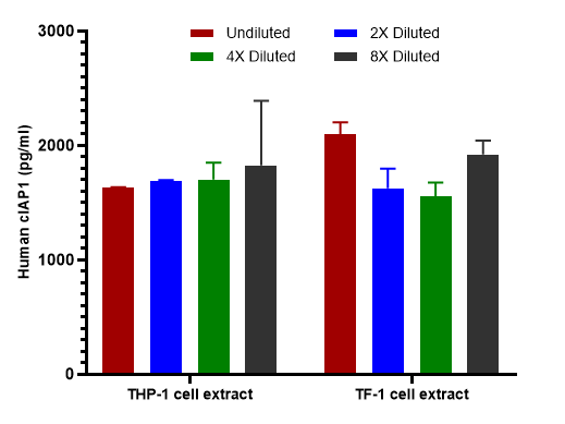 The concentrations of cIAP1 were measured in duplicates, interpolated from the cIAP1 standard curve and corrected for sample dilution. Undiluted samples are THP-1 extract 25% and TF-1 extract 50%. The interpolated dilution factor corrected values are plotted (mean +/- SD, n=2). The mean cIAP1 concentration was determined to be 1,712 pg/ml in THP-1 extract and 1,800 pg/ml in TF-1 extract.