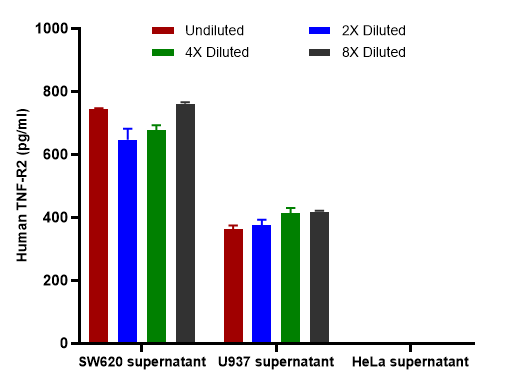 The concentrations of TNF-R2 were measured in duplicates, interpolated from the TNF-R2 standard curve and corrected for sample dilution. Undiluted samples are U937 cell culture supernatant 100%, SW620 cell culture supernatant 100% and HeLa cell culture supernatant. The interpolated dilution factor corrected values are plotted (mean +/- SD, n=2). The mean TNF-R2 concentration was determined to be 392.5 pg/ml in U937 cell culture supernatant, 707.2 pg/ml in SW620 cell culture supernatant and undetectable in HeLa cell culture supernatant.