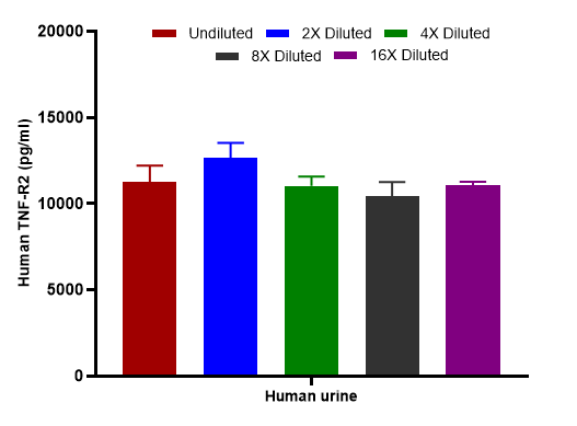 The concentrations of TNF-R2 were measured in duplicates, interpolated from the TNF-R2 standard curve and corrected for sample dilution. Undiluted samples are human urine 20%. The interpolated dilution factor corrected values are plotted (mean +/- SD, n=2). The mean TNF-R2 concentration was determined to be 8,928 pg/ml in human urine.