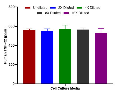 The concentrations of TNF-R2 were measured in duplicates, interpolated from the TNF-R2 standard curves and corrected for sample dilution. Undiluted samples are as follows: cell culture media 25%. The interpolated dilution factor corrected values are plotted (mean +/- SD, n=2).