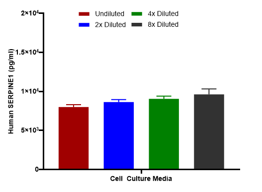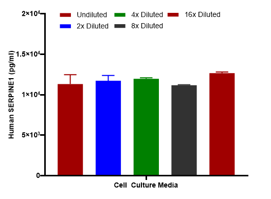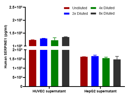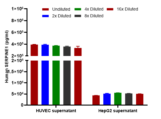 Interpolated concentration of native PAI1 was measured in duplicate at different sample concentrations. The interpolated dilution factor corrected values were plotted (mean +/- SD, n=2). The mean PAI1 concentration was determined to be 1276000pg/mL in HUVEC sups, 158000 pg/ml in HepG2 cell culture supernatant.