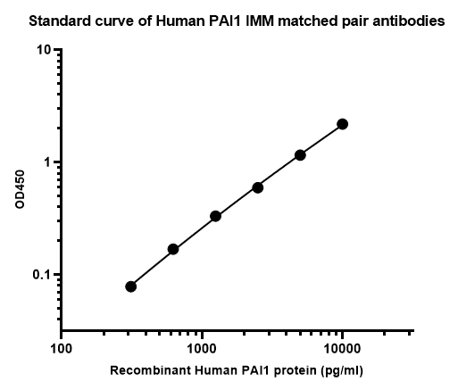 Elisa assay was performed by coating wells of a 96-well plate with 100 µl per well of capture antibody (HA723435) diluted in carbonate/bicarbonate buffer, at a concentration of 5 µg/mL overnight at 4℃. Wells of the plate were washed, blocked with 150 µl 0.05% tween-20 1% BSA blocking buffer, and incubated with serial diluted Recombinant Human PAI1 protein (HA210982) starting from 10,000 pg/ml to 0 pg/ml and detect antibody (HA723436, Biotin, 0.2 µg/ml) for 1 hour at 30℃ with shaking. Then the plate was washed and incubated with 100 µl per well of SA-HRP for 0.5 hour at 30℃ with shaking. Detection was performed using an Ultra TMB Substrate for 10 minutes at room temperature in the dark. The reaction was stopped with sulfuric acid and absorbances were read on a spectrophotometer at 450 nm.