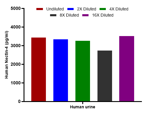 The concentrations of Nectin-4 were interpolated from the Nectin-4 standard curve and corrected for sample dilution. Undiluted samples are human urine 50%. The mean Nectin-4 concentration was determined to be 3,260 pg/ml in human urine.
