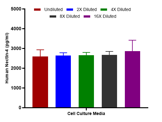 The concentrations of Nectin-4 were measured in duplicates, interpolated from the Nectin-4 standard curves and corrected for sample dilution. Undiluted samples are as follows: cell culture media 50%. The interpolated dilution factor corrected values are plotted (mean +/- SD, n=2).