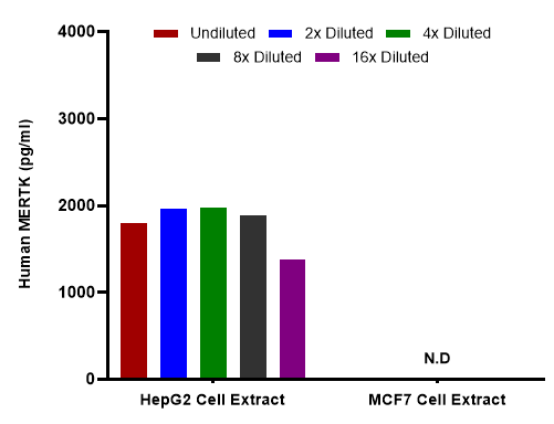 Interpolated concentration of native MERTK was measured in duplicate at different sample concentrations and interpolated from the MERTK standard curves. The mean MERTK concentration was determined to be 1,799 pg/mL in Hep G2 cell extract, There was no detectable signal in MCF7 cell extract.