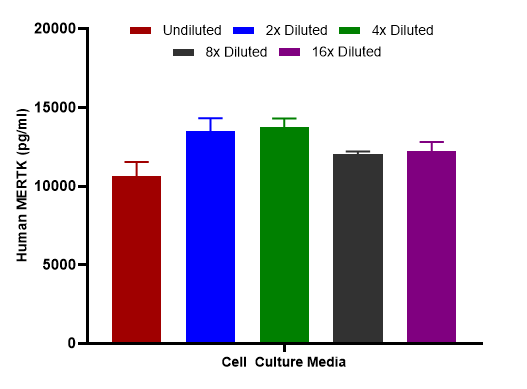 The concentrations of MERTK were measured in duplicates, interpolated from the MERTK standard curves and corrected for sample dilution. Undiluted samples are as follows: cell culture media 50%. The interpolated dilution factor corrected values are plotted (mean +/- SD, n=2).