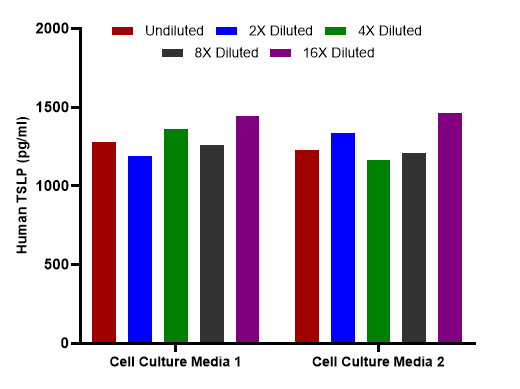 The concentrations of TSLPwere interpolated from the TSLP standard curves and corrected for sample dilution. Undiluted samples are as follows: cell culture media 1 25%, cell culture media 2 50%.