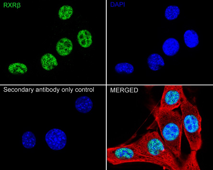 Cells were fixed in 4% paraformaldehyde for 15 minutes at room temperature, permeabilized with 0.1% Triton X-100 in PBS for 15 minutes at room temperature, then blocked with 1% BSA in 10% negative goat serum for 1 hour at room temperature. Cells were then incubated with Rabbit anti-Retinoid X Receptor beta / RXRB antibody (HA723542) at 1/100 dilution in 1% BSA in PBST overnight at 4 ℃. Goat Anti-Rabbit IgG H&L (iFluor™ 488, HA1121) was used as the secondary antibody at 1/1,000 dilution. PBS instead of the primary antibody was used as the secondary antibody only control. Nuclear DNA was labelled in blue with DAPI.