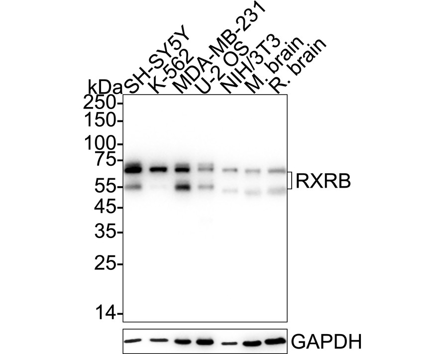 Western blot analysis of Retinoid X Receptor beta / RXRB on different lysates with Rabbit anti-Retinoid X Receptor beta / RXRB antibody (HA723542) at 1/5,000 dilution.