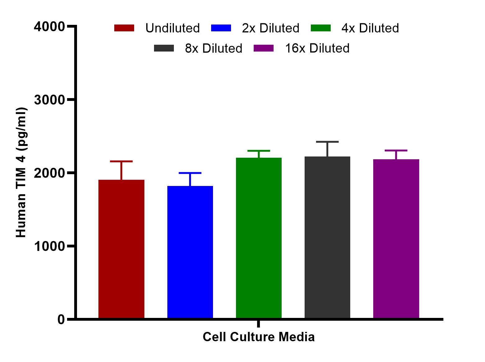 The concentrations of TIM 4 were measured in duplicates, interpolated from the TIM 4 standard curves and corrected for sample dilution. Undiluted samples are as follows: cell culture media 50%. The interpolated dilution factor corrected values are plotted (mean +/- SD, n=2).