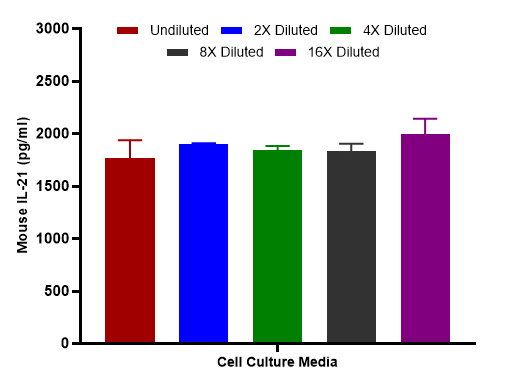 The concentrations of IL-21 were measured in duplicates, interpolated from the IL-21 standard curves and corrected for sample dilution. Undiluted samples are as follows: cell culture media 50%. The interpolated dilution factor corrected values are plotted (mean +/- SD, n=2).