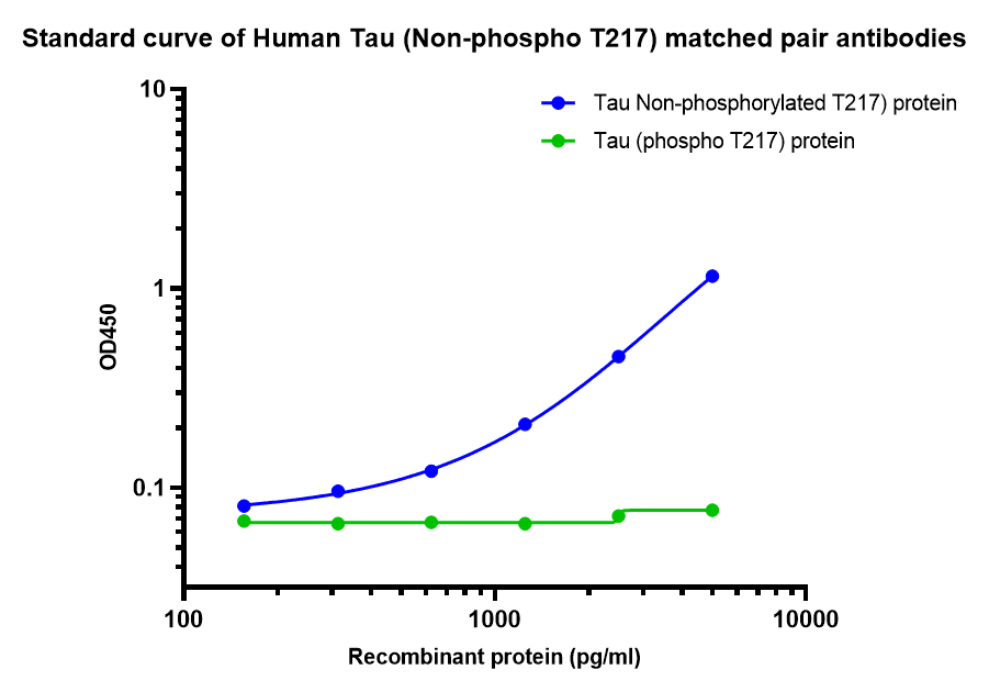 Elisa assay was performed by coating wells of a 96-well plate with 100 µl per well of capture antibody (HA723843) diluted in carbonate/bicarbonate buffer, at a concentration of 5ug/ml overnight at 4℃. Wells of the plate were washed, blocked with 150 µl 0.05% tween-20 1% BSA blocking buffer, and incubated with serial diluted Recombinant Human Phospho-Tau (T217) protein (HA210937) starting from 30000 pg/ml to 0 pg/ml and detect antibody (HA723209, Biotin, 0.2 µg/ml) for 1 hour at 30℃ with shaking. Then the plate was washed and incubated with 100 µl per well of SA-HRP for 0.5 hour at 30℃ with shaking. Detection was performed using an Ultra TMB Substrate for 10 minutes at room temperature in the dark. The reaction was stopped with sulfuric acid and absorbances were read on a spectrophotometer at 450 nm.