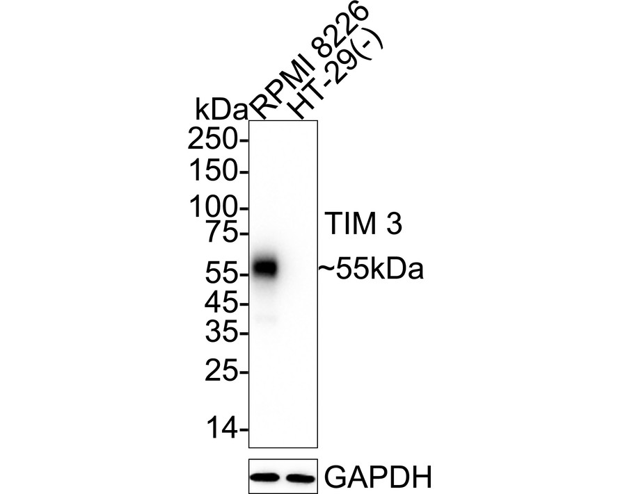 Western blot analysis of TIM 3 on different lysates with Rabbit anti-TIM 3 antibody (HA723854) at 1/2,000 dilution.