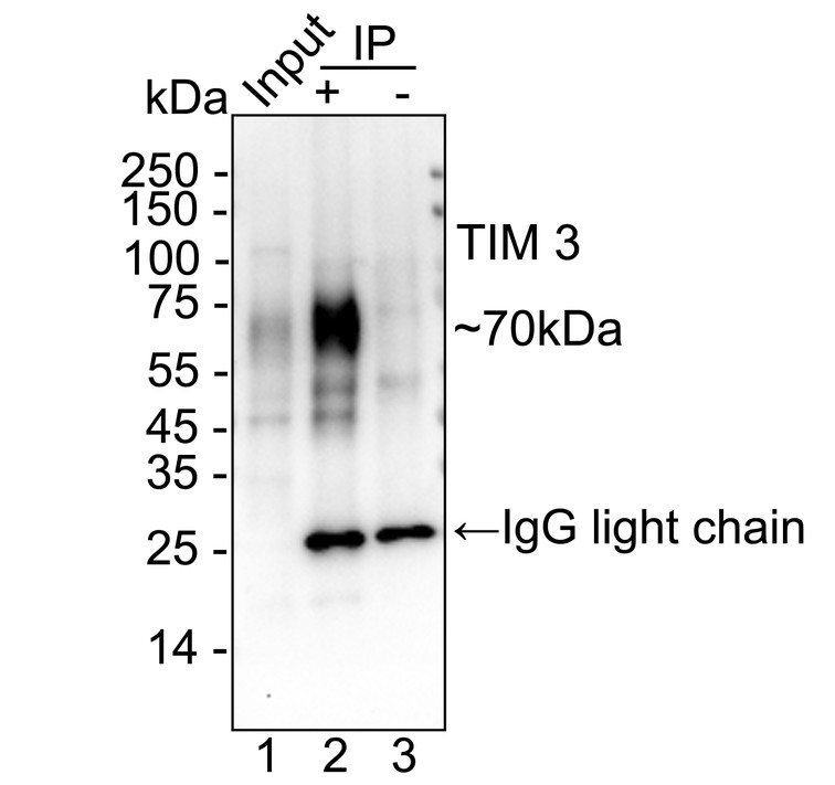 TIM 3 was immunoprecipitated from 0.2 mg RAW264.7 cell lysate with HA723854 at 2 µg/10 µl beads. Western blot was performed from the immunoprecipitate using HA723854 at 1/2,000 dilution. HRP Conjugated Anti-Rabbit IgG for IP Nano-secondary antibody at 1/5,000 dilution was used for 1 hour at room temperature.