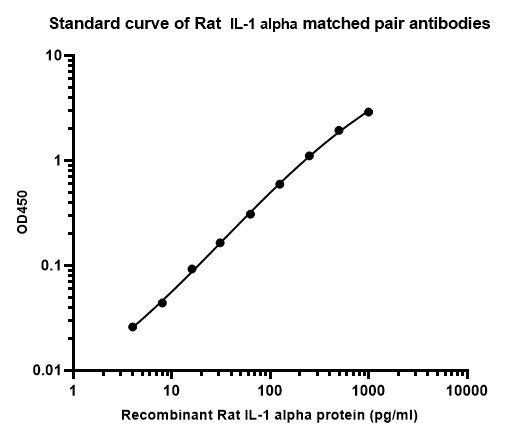 Elisa assay was performed by coating wells of a 96-well plate with 100 µl per well of capture antibody (HA723989) diluted in carbonate/bicarbonate buffer, at a concentration of 2ug/ml overnight at 4℃. Wells of the plate were washed, blocked with 150 µl 0.05% tween-20 1% BSA blocking buffer, and incubated with serial diluted Recombinant Rat IL-1 alpha protein (HA211058) starting from 1,000 pg/ml to 0 pg/ml and detect antibody (HA723990, Biotin, 0.2 µg/ml) for 1 hour at 30℃ with shaking. Then the plate was washed and incubated with 100 µl per well of SA-HRP for 0.5 hour at 30℃ with shaking. Detection was performed using an Ultra TMB Substrate for 10 minutes at room temperature in the dark. The reaction was stopped with sulfuric acid and absorbances were read on a spectrophotometer at 450 nm.