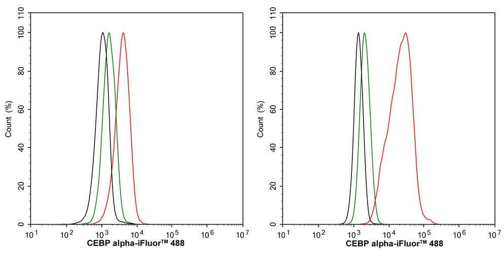 Flow cytometric analysis of Jurkat (left, negative) and THP-1 (right, positive) cells labeling CEBP alpha.