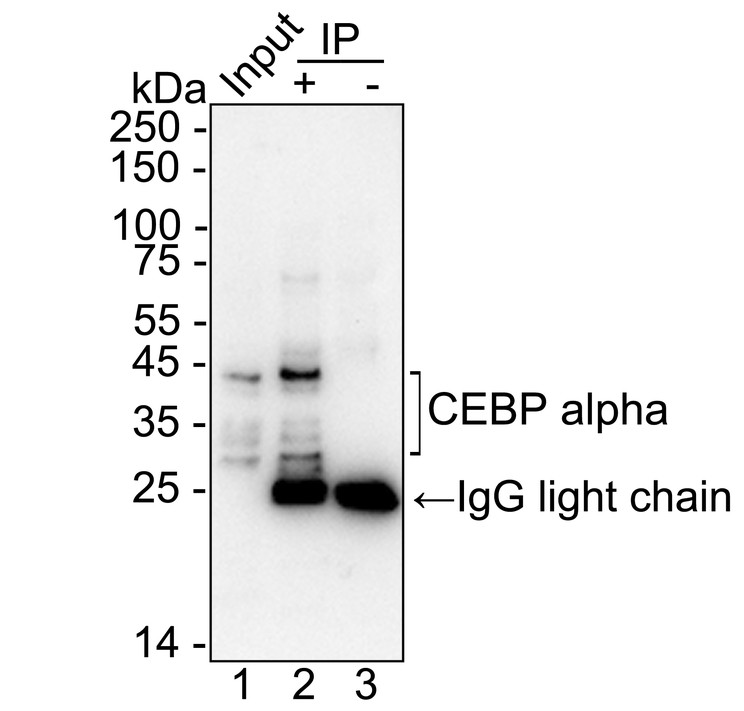 CEBP alpha was immunoprecipitated from 0.2 mg LNCaP cell lysate with HA724154 at 2 µg/10 µl beads. Western blot was performed from the immunoprecipitate using HA724154 at 1/5,000 dilution. HRP Conjugated Anti-Rabbit IgG for IP Nano-secondary antibody at 1/5,000 dilution was used for 1 hour at room temperature.