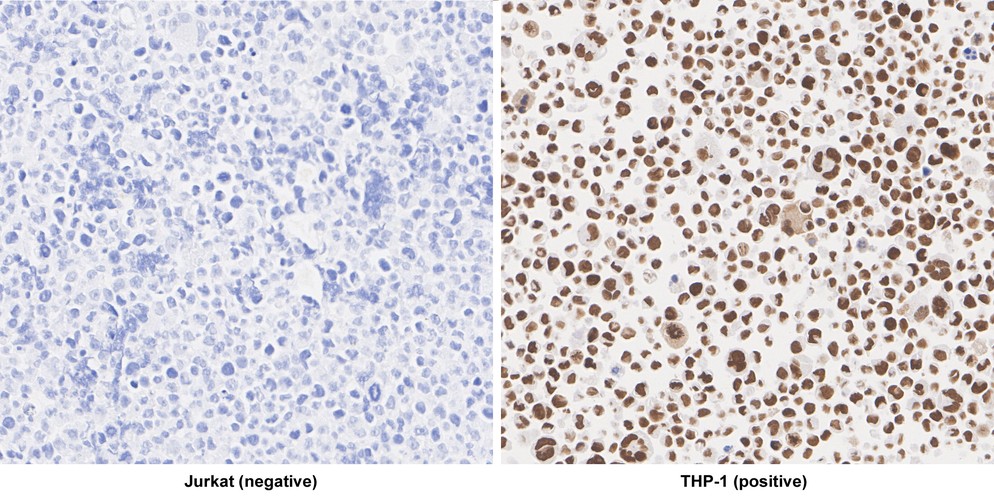 Immunohistochemical analysis of paraffin-embedded Jurkat (left, negative) and THP-1 (right, positive) cells with Rabbit anti-CEBP alpha antibody (HA724154) at 1/1,000 dilution.