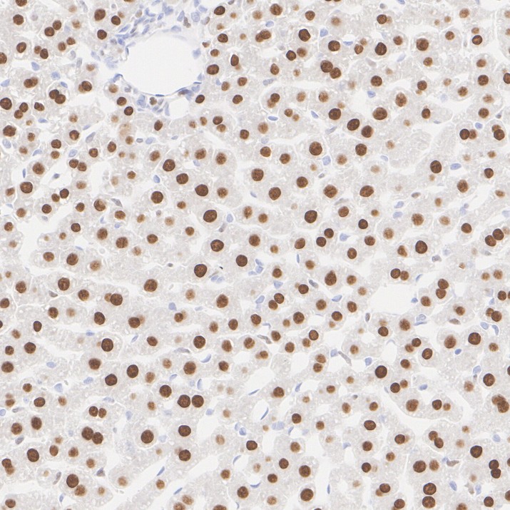 Immunohistochemical analysis of paraffin-embedded mouse liver tissue with Rabbit anti-CEBP alpha antibody (HA724154) at 1/1,000 dilution.