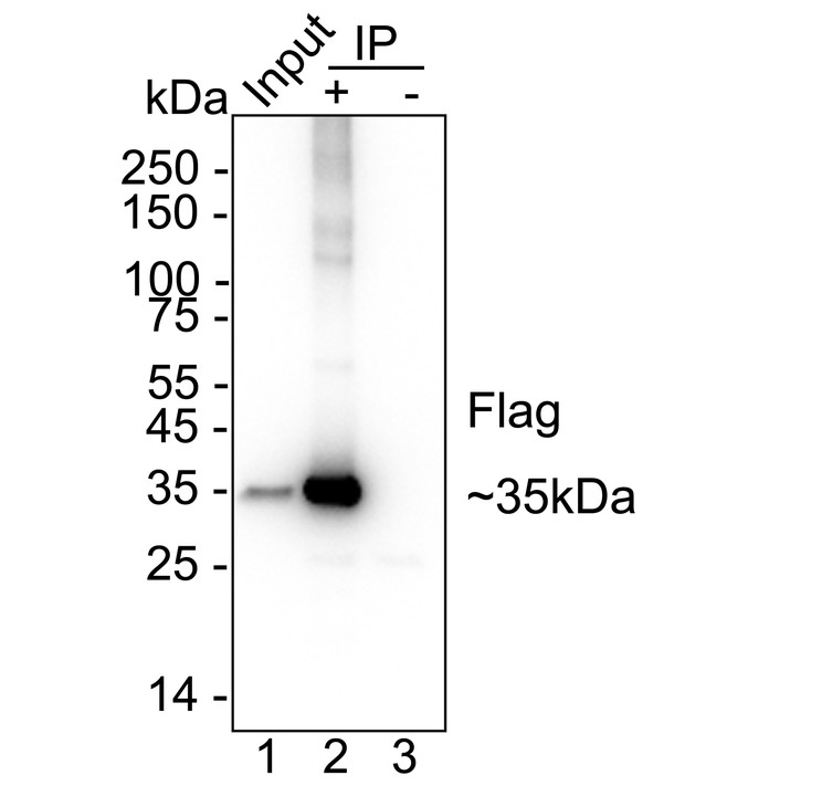 DYKDDDDK Tag (FLAG) was immunoprecipitated from 0.2 mg 293T transfected with FLAG-tagged PD-L1 (C-terminal) cell lysate with HA724169 at 2 µg/10 µl beads. Western blot was performed from the immunoprecipitate using HA724169 at 1/20,000 dilution. HRP Conjugated Anti-Rabbit IgG for IP Nano-secondary antibody at 1/5,000 dilution was used for 1 hour at room temperature.