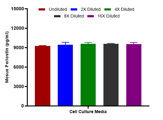 The concentrations of Periostin were measured in duplicates, interpolated from the Periostin standard curves and corrected for sample dilution. Diluted samples are as follows: 25% cell culture media with FBS. The interpolated dilution factor corrected values are plotted (mean +/- SD, n=2).