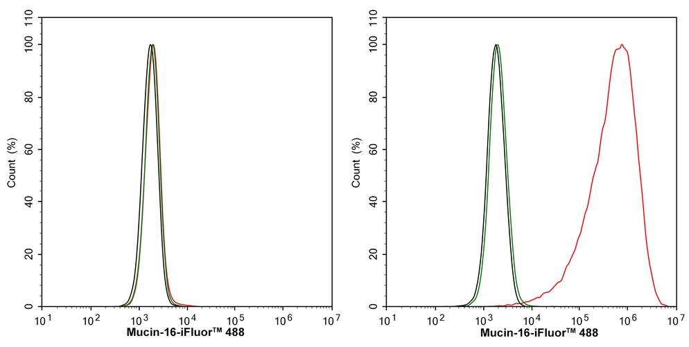 Flow cytometric analysis of SK-OV-3 (left, negative) and NIH:OVCAR-3 (right, positive) cells labeling MUC16.